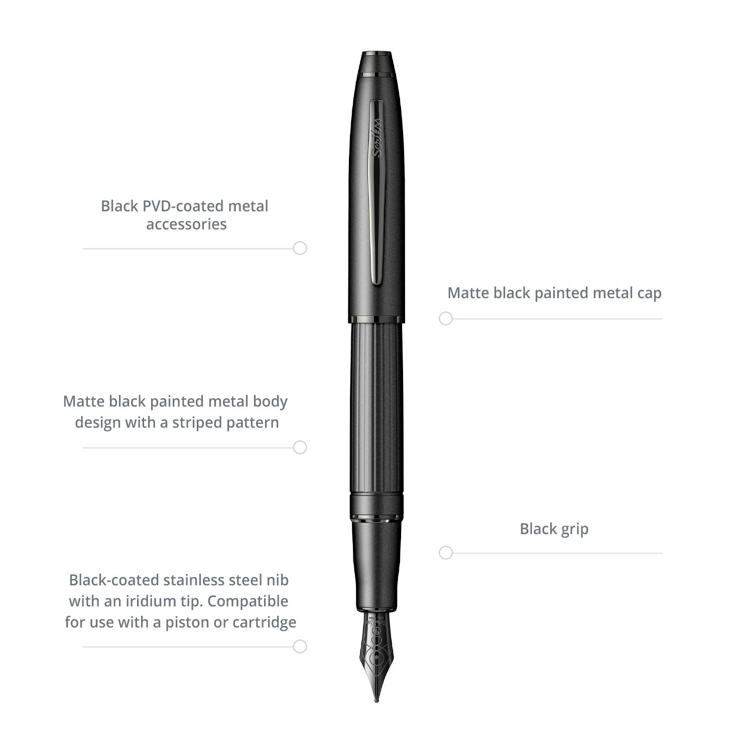 Black-coated stainless steel nib with an iridium tip. Compatible for use with a piston or cartridge.